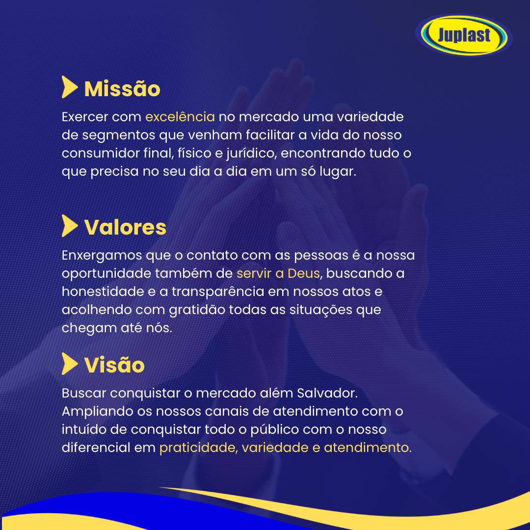 Fundada em 2011 a Juplast iniciou suas atividades na Rua Direta de Cosme de Farias, bairro de Cosme de Farias com nome fantasia Ju e Ju Papelaria e cia. Gradativamente, com a permissão de Deus, foi se expandindo e hoje você encontra a loja da Juplast TAMBÉM na Rua Frederico Costa, bairro de Brotas e na Rua dos Bandeirantes, bairro do Matatu.